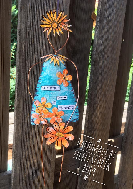 Het lijfje is een gelli print met verf op canvasdoek. Het frame is van electriciteitsdraad.