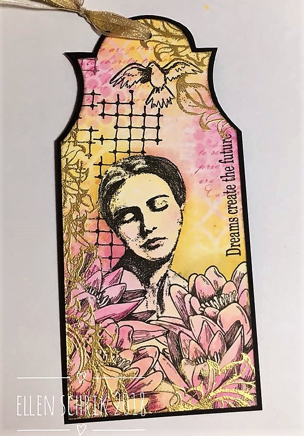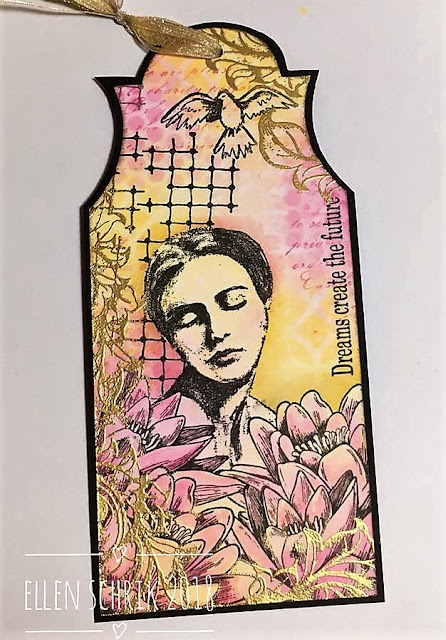 For Pronty I made this large tag. On the Pronty blog you can see step by step how I made it. All stencils are by Pronty, the stamps by Art Journey: Freya, Lily, Imagine and Inspire.